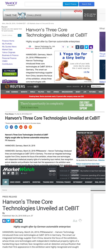 中国IT创新标杆企业汉王科技,首次携带手写输入法、人脸识别、空气检测和净化这三大针对汽车领域的核心技术,惊艳亮相2016年德国汉诺威消费电子、信息及通信博览会CEBIT。展会上,汉王科技自主产权的技术受到了众多德国车企的肯定和追捧,成为展会名副其实的“人气王”。这也引起了Yahoo、路透社、FOX福克斯电视台、ABC、NBC、CBS等近200家国外主流媒体竞相报道。一时间,汉王科技占据“国际头条”成为国际业界瞩目的焦点。